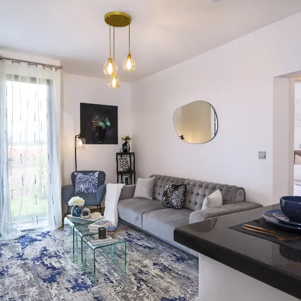 - Open plan lounge with balcony (glass railing + double leaf doors)